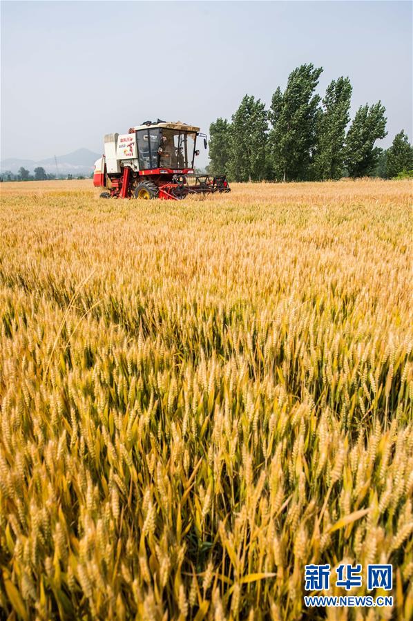 收割机在山东省青州市邵庄镇朱王孔村的麦田里作业(6月5日摄)。新华社发(王继林 摄)