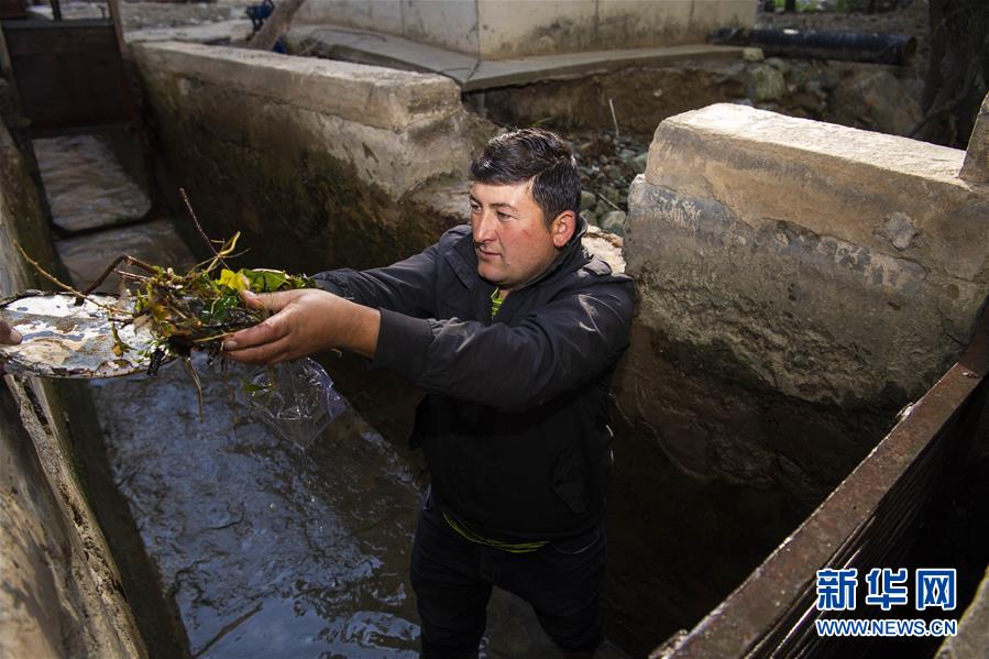 在新疆塔什库尔干塔吉克自治县大同乡,阿米尔江·艾力木在清理“小水电”水坝内的树叶(6月14日摄)。新华社记者 胡虎虎 摄