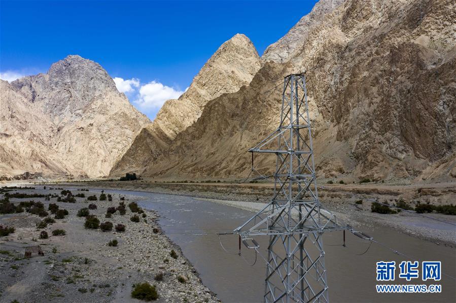输电线路穿越河谷,向新疆塔什库尔干塔吉克自治县大同乡延伸(6月14日摄,无人机照片)。按计划,今年6月底前,大同乡将首次接通大网电。新华社记者 胡虎虎 摄