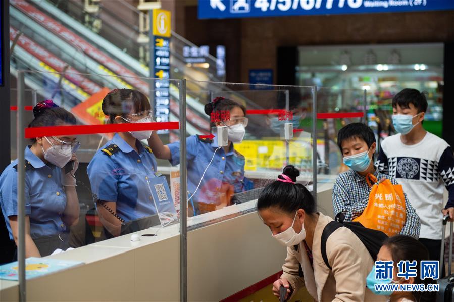 6月18日,北京站工作人员和旅客隔着透明隔板交流。 自6月16日北京市突发公共卫生应急响应级别由三级调至二级后,北京站加大防控力度,加强消杀、测温等工作,并根据客流情况,动态调整列车开行对数。 新华社发(陈钟昊摄)