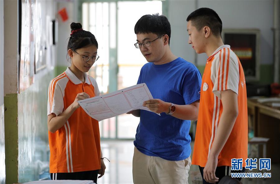 6月18日,河北省衡水市第十四中学高三年级数学老师(中)为学生讲解试题。 距2020年全国高考还有不到20天的时间,考生复习进入最后冲刺阶段。河北省衡水市第十四中学在积极做好高三学生复习备考的同时,开展多种形式的减压活动,帮助学生释放紧张情绪,以自信乐观的心态迎接高考。 新华社记者 朱旭东 摄