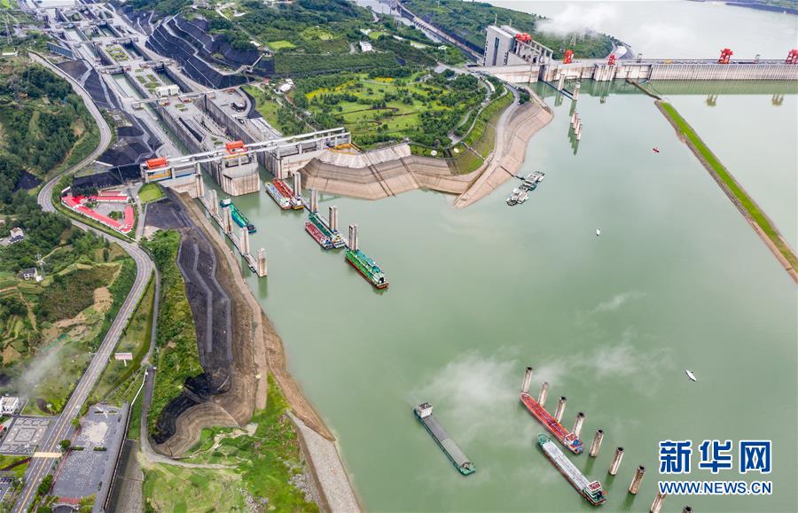 6月18日,船舶有序通过三峡五级船闸(无人机照片)。新华社发(郑家裕 摄)