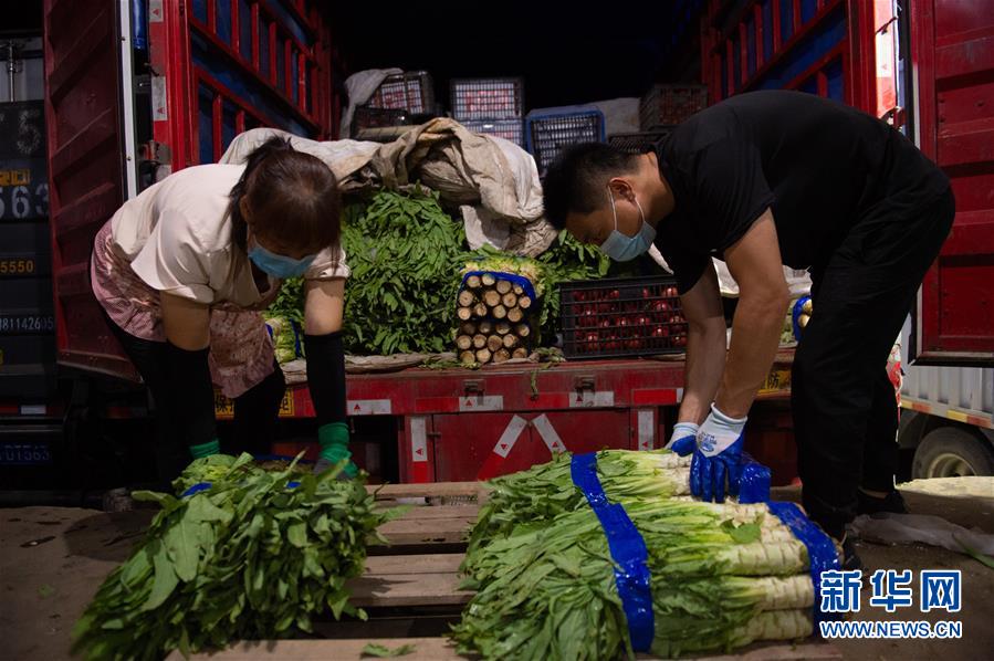 6月17日2时51分,超市发公司果蔬配送中心工人将蔬菜卸下货车。 新华社发(陈钟昊 摄)