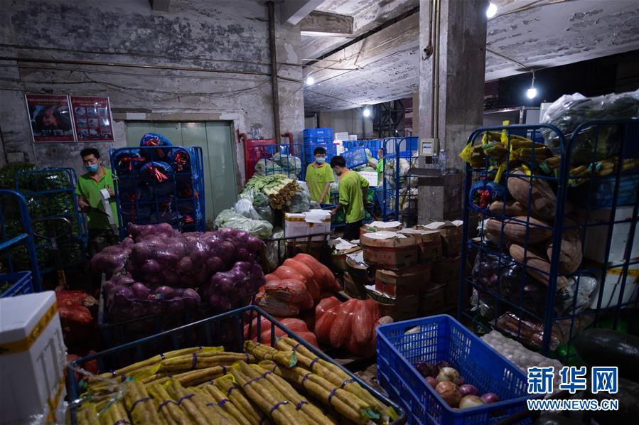 6月17日3时,超市发公司果蔬配送中心工人在货区分装、调配从各地运来的蔬菜。新华社发(陈钟昊 摄)
