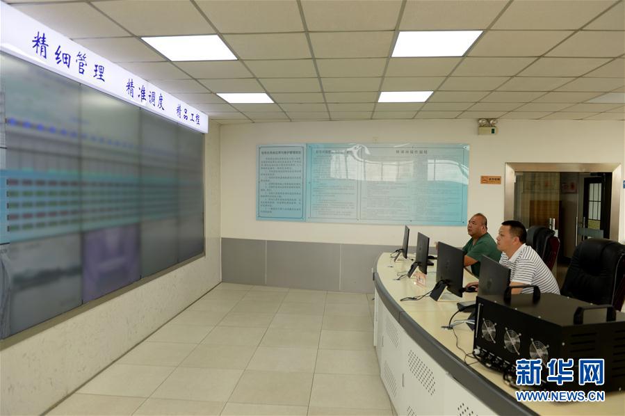 6月16日,在蚌埠闸工程管理处控制室内,两名工作人员查看计算机监控系统。 新华社发(黄博涵摄)