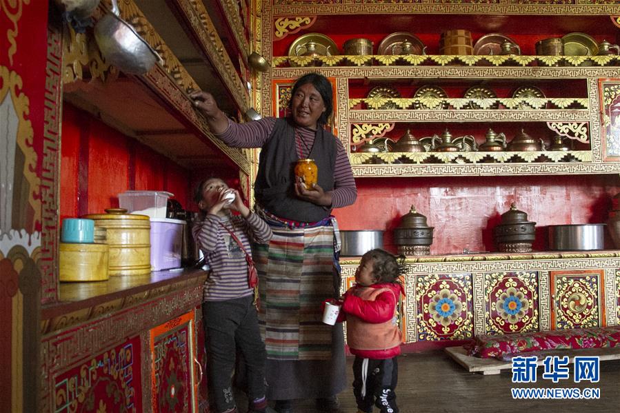 5月30日,四川甘孜藏族自治州理塘县奔戈乡卡灰村村民阿曲在家中照看外孙和外孙女。新华社记者 李梦馨 摄