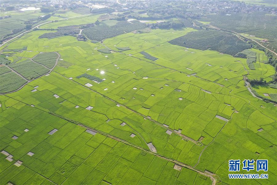 广西武宣县二塘镇的田园风光(6月18日摄,无人机照片)。 夏日时节,广西武宣县二塘镇的田间绿意盎然,景色如画。 新华社记者 曹祎铭 摄