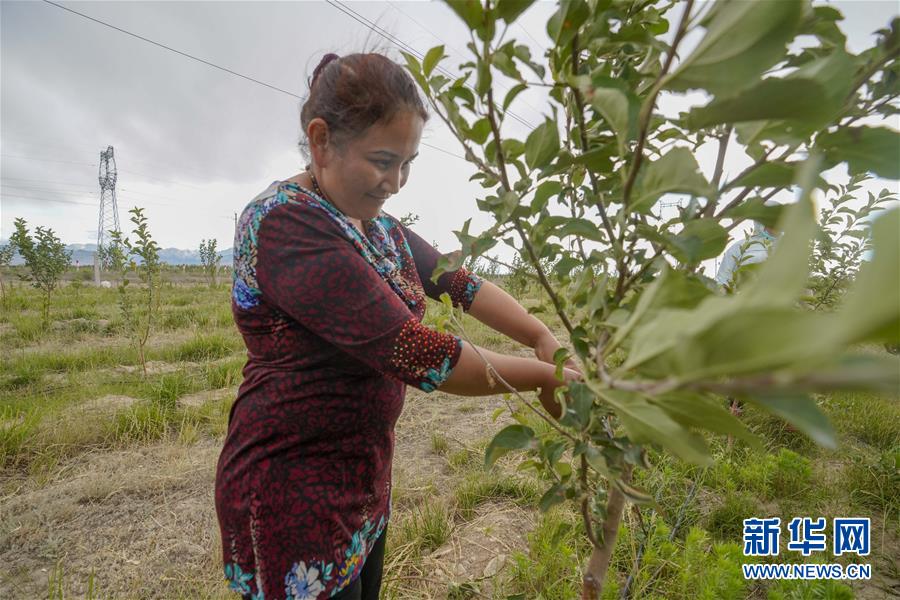 在新疆察布查尔锡伯自治县一处生态扶贫林,来自海努克乡托普亚尕奇村的贫困户沙比热木·玛合木提在修剪树枝(6月16日摄)。新华社记者 赵戈 摄