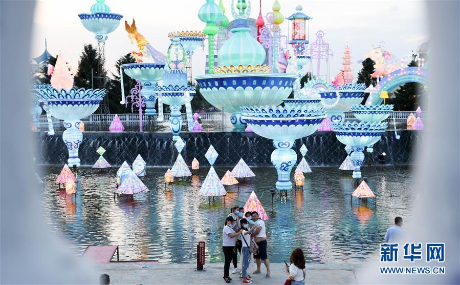 6月19日,游客在长春市长影世纪城内的彩灯前合影。新华社发(颜麟蕴摄)