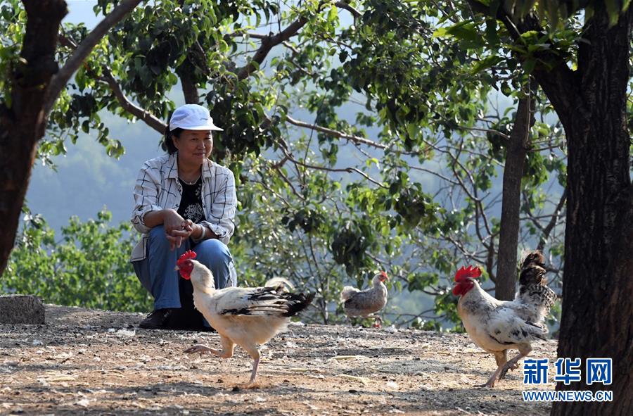 6月19日,在天津东山鹊山鸡养殖专业合作社的养殖基地,胡金艳在观察鹊山鸡。新华社记者 马平 摄