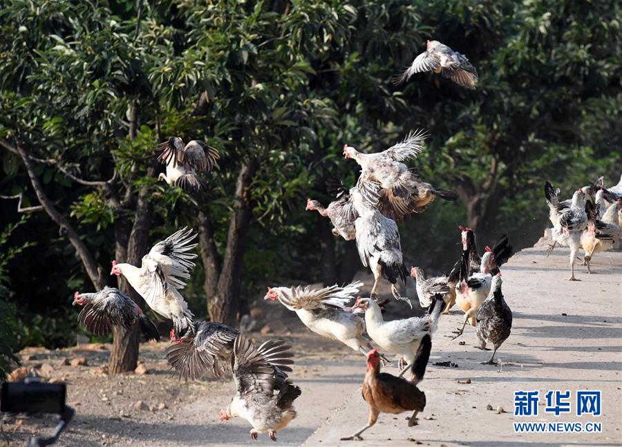 6月19日,在天津东山鹊山鸡养殖专业合作社的养殖基地,鹊山鸡飞出鸡舍。新华社记者 马平 摄