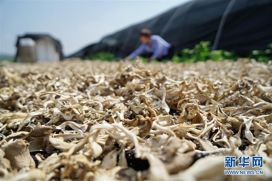 6月19日,农民在迁西县兴城镇盈溢栗蘑种植基地内晾晒栗蘑。 新华社记者 牟宇 摄