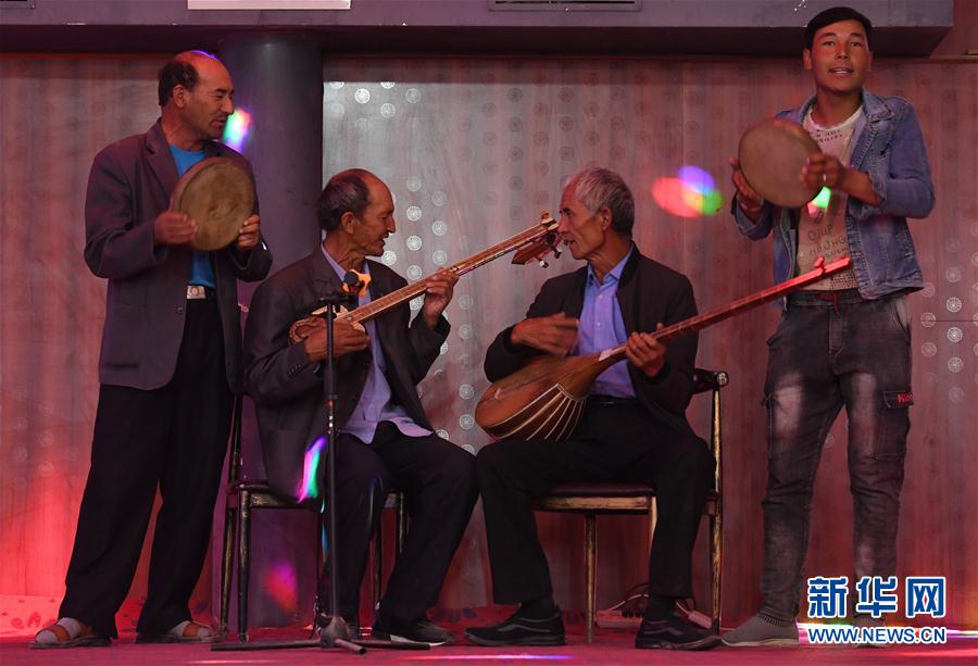 在新疆于田县兰干乡兰干夜市,4名“草根艺人”用手鼓、热瓦普、都塔尔组合演出(5月20日摄)。新华社记者 沙达提 摄