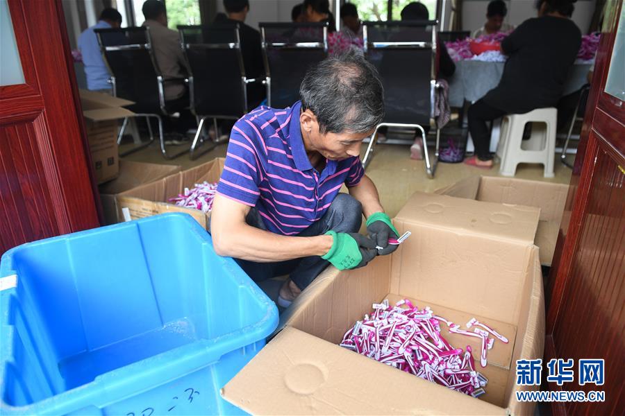 在泗阳县卢集镇郝桥村“残疾人之家”,残疾人在组装剃须刀(6月19日摄)。 近年来,江苏省宿迁市泗阳县以村(社区)“残疾人之家”为依托,帮助残疾人联系简单易学、适合操作的劳动项目。通过辅助性就业,提高残疾人的生活水平,增强他们的获得感。据介绍,经过培训后,全县852名残疾人实现在家门口就业。 新华社记者 季春鹏 摄