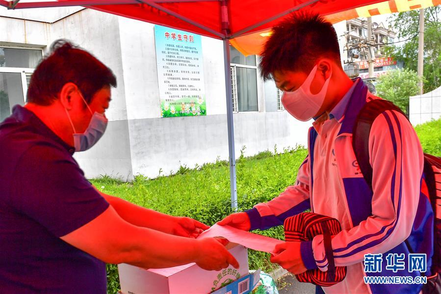 6月20日,在吉林江城中学,学生递交健康状况信息登记表。 当日,吉林省吉林市城区初三年级学生开学复课,备战中考。6月7日起,吉林市城区风险等级调整为低风险。 新华社记者张楠摄