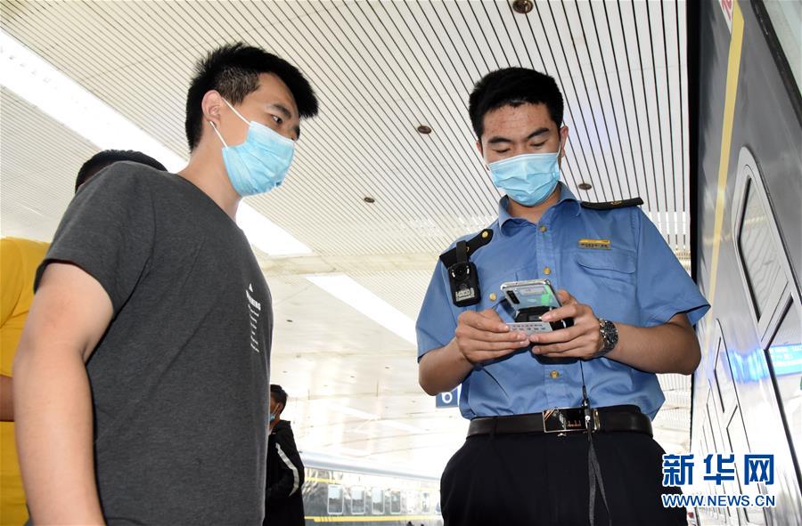6月20日,普速列车乘务员(右)在济南站用电子设备核验乘客的电子客票。 当日,电子客票在全国普速铁路推广实施,更多旅客将享受电子客票“一证通行”带来的便利。 新华社记者王凯摄