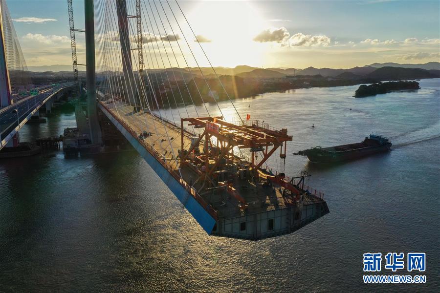 6月19日拍摄的广州南沙港铁路跨西江特大斜拉桥钢箱梁吊装和斜拉索施工现场(无人机照片)。 由中铁十一局承建的粤港澳大湾区基础设施“硬联通”重点工程——广州南沙港铁路跨西江特大斜拉桥预计将在一个月后合龙。该桥位于广东佛山市和江门市交界处,全长1117.5米。 新华社记者 刘大伟 摄