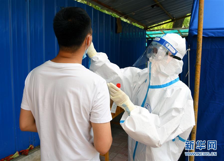 6月20日,在北京市海淀医院核酸检测采样点,医护人员(右)为市民进行核酸检测采样。 新华社记者 任超 摄