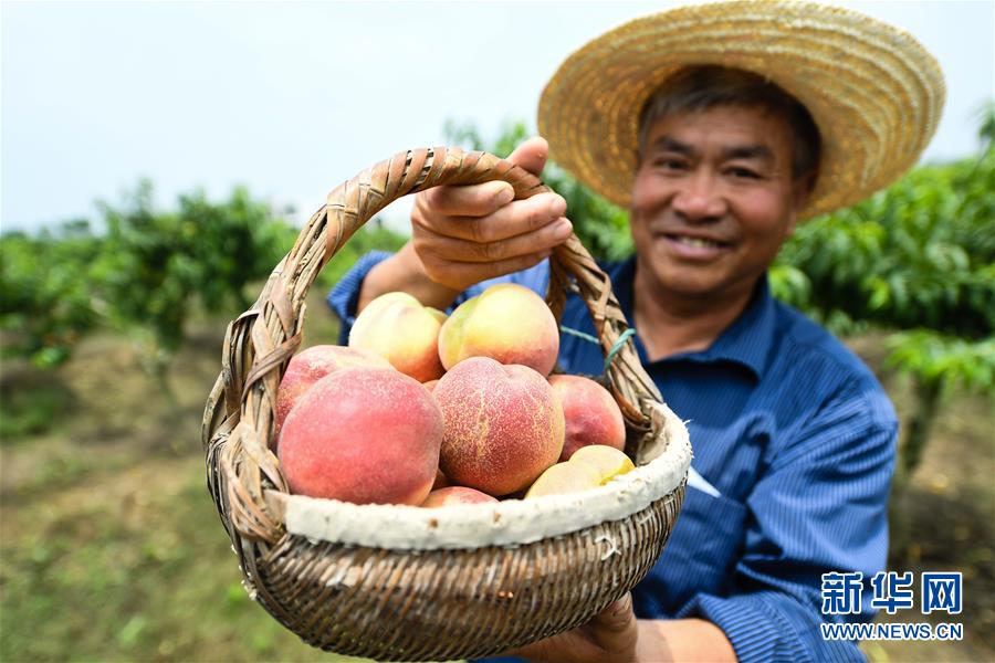 6月19日,在泗阳县卢集镇桃果种植示范基地,果农展示收获的鲜桃。 自2013年起,江苏省宿迁市泗阳县大力发展桃果产业,种植面积达6万亩,有40多个名特优品种,每年5月到11月均有成熟鲜桃上市,年产鲜桃10多万吨,逾1.2万人从事桃果产业相关工作,2800多户低收入农户依靠桃果产业实现脱贫增收。 新华社记者 季春鹏 摄