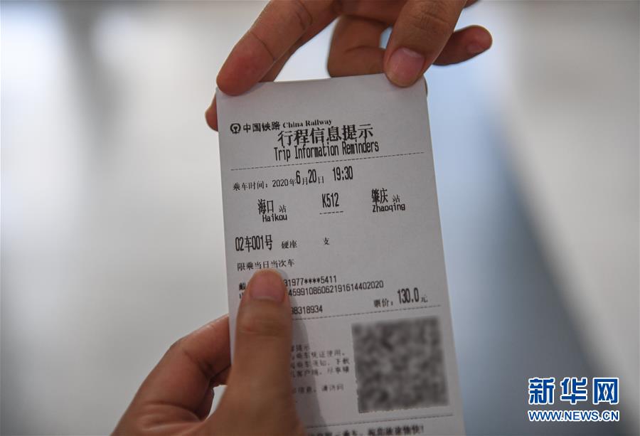 6月20日,工作人员在海口火车站展示实施电子客票后打出的“行程信息提示单”,上面印有相关电子客票信息。 新华社记者 蒲晓旭 摄