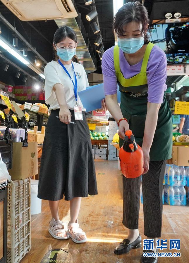 6月19日,北京市丰台区东高地街道工作人员(左)检查辖区内商户环境消毒防疫工作。 新华社记者 李欣 摄