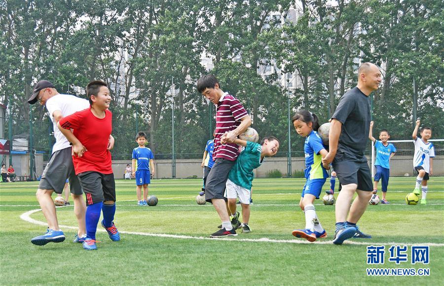 6月20日,小朋友和爸爸在主题活动中玩亲子足球趣味游戏。 当日,山东省烟台市福山区一足球训练营举办“父爱如山,快乐相伴”主题活动,让孩子们在快乐运动的过程中感受浓浓的父爱,迎接即将到来的父亲节。 新华社发(孙文潭 摄)