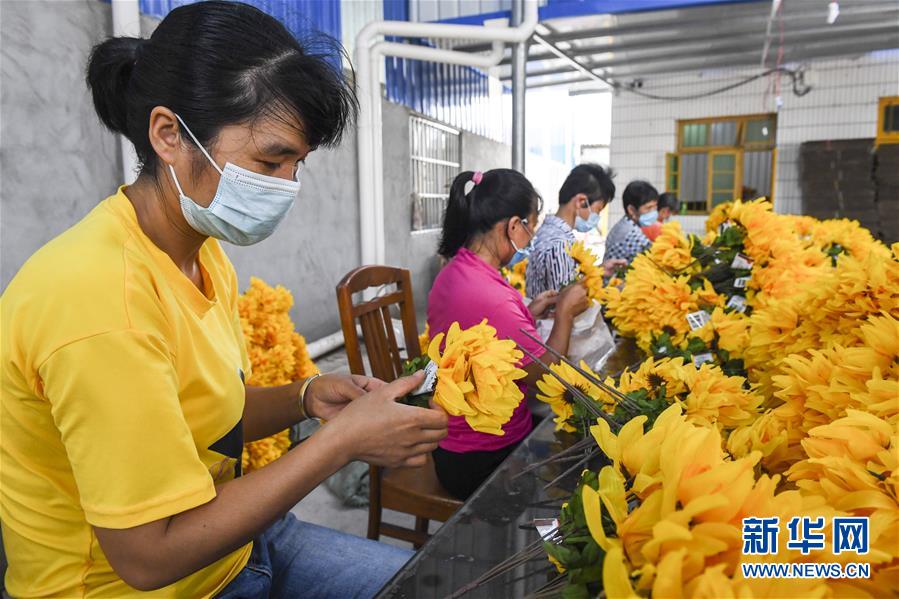 工人在广西武宣县一家生产塑料花的就业扶贫车间内工作(6月20日摄)。 新华社记者 曹祎铭 摄