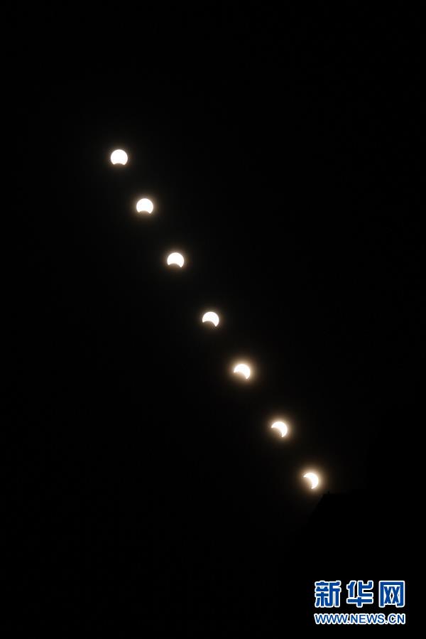 这是6月21日在北京拍摄的日食(多重曝光)。 “日环食”天文景观于6月21日“夏至日”下午在天宇上演。 新华社记者 孟鼎博摄