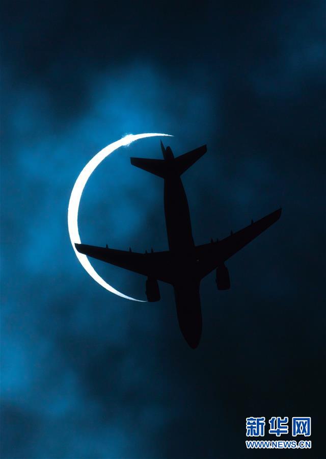 6月21日,拉萨上空一架飞机飞过发生日食的太阳。 “日环食”天文景观于6月21日“夏至日”下午在天宇上演。 新华社记者 普布扎西 摄
