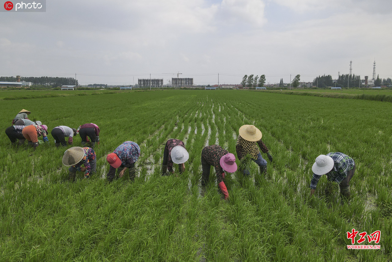 2020年6月21日,江苏省淮安市洪泽区陆续进入水稻秧苗栽插期,当地农民紧抓农时开展栽插和田间管护工作,确保水稻丰产丰收。万震/IC photo