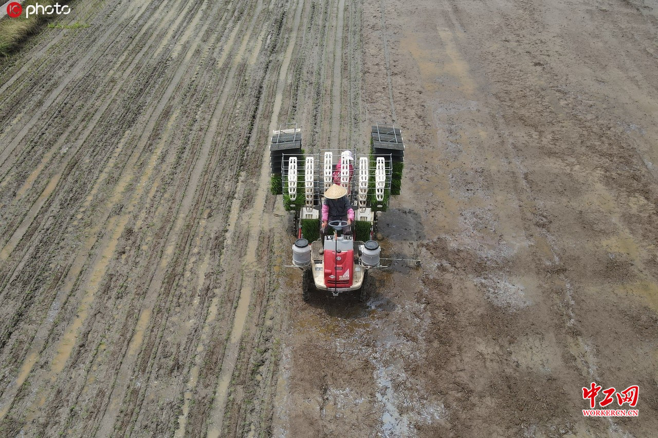 2020年6月21日,江苏省淮安市洪泽区陆续进入水稻秧苗栽插期,当地农民紧抓农时开展栽插和田间管护工作,确保水稻丰产丰收。万震/IC photo