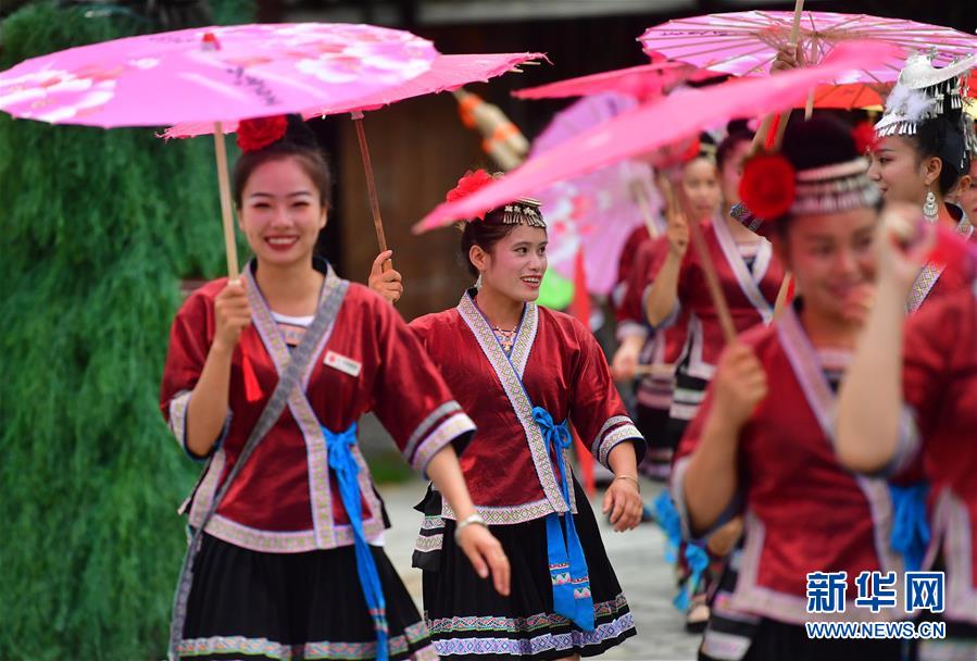 在广西融水双龙沟森林旅游度假区梦呜苗寨,搬迁过来的苗族姑娘准备给游客表演民族舞蹈(6月21日摄)。近年来,融水打造原生态苗族文化体验园——梦呜苗寨,让搬迁进城的贫困户住进复原建设的老房子。景区提供绿化保洁、游乐设施管理、民族歌舞表演等工作岗位,多渠道增加贫困户收入。 新华社记者 黄孝邦 摄
