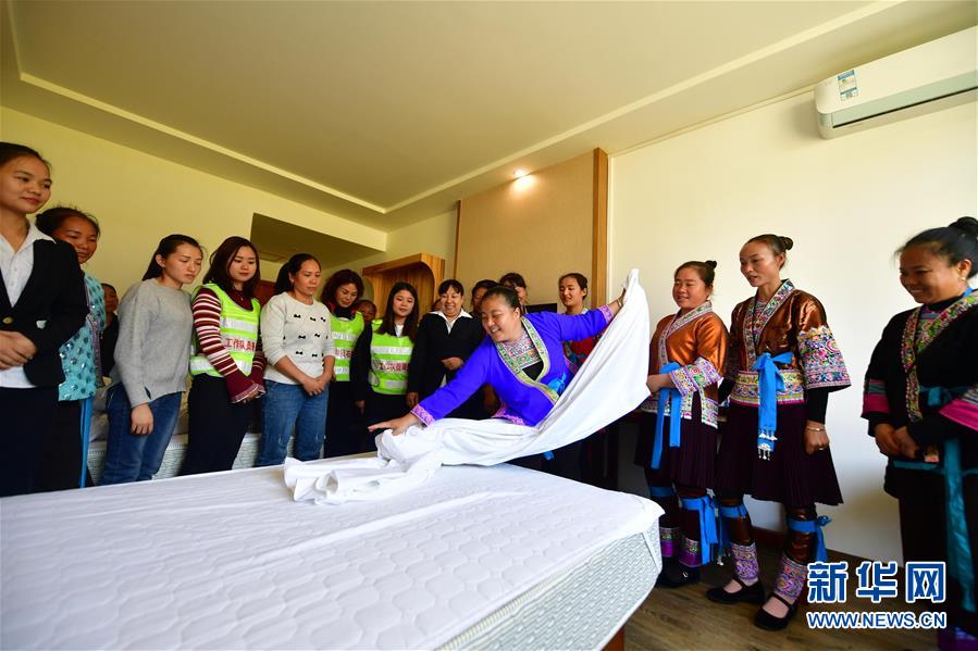 在广西融水苗族自治县香粉乡雨卜村,扶贫工作队员和致富带头人在学习客房服务技能(2019年11月4日摄)。 新华社记者 黄孝邦 摄