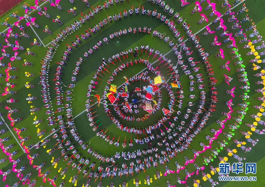 在广西融水苗族自治县民族体育公园,当地群众在芦笙斗马节开幕式上表演歌舞(无人机照片,2017年11月18日摄)。 新华社记者 黄孝邦 摄