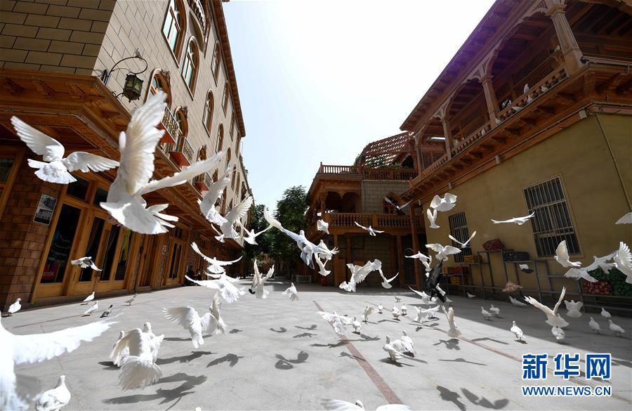 一群鸽子在新疆和田市鸽子巷觅食(5月26日摄)。 新华社记者 沙达提 摄