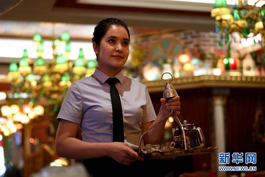 新疆和田市鸽子巷一家餐厅的服务员在工作(5月27日摄)。 新华社记者 沙达提 摄