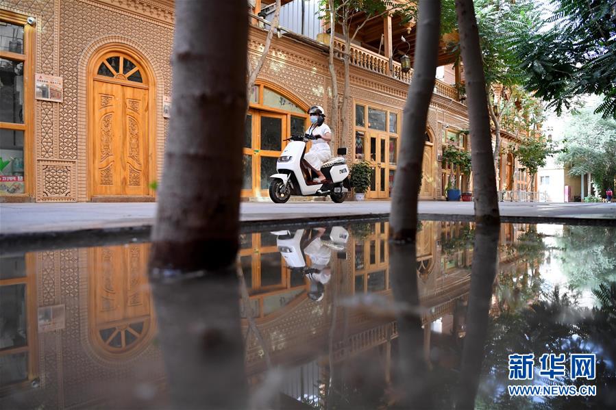 一名居民骑电动车行驶在新疆和田市鸽子巷里(5月27日摄)。 新华社记者 沙达提 摄