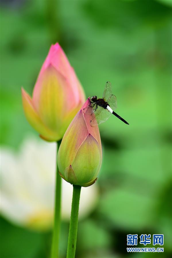 6月22日,在江苏省如皋市龙游河生态公园,一只蜻蜓停歇在含苞待放的荷花上。 夏日时节,荷塘清香飘荡,成为迷人景致。 新华社发(吴树建 摄)