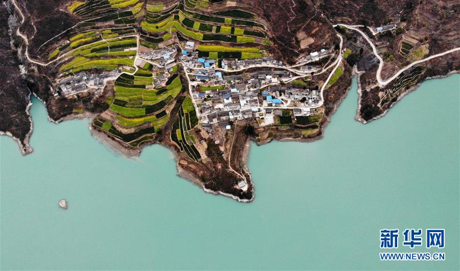 甘肃省陇南市文县白龙江畔山坡上的油菜花田(3月11日摄,无人机照片)。新华社记者 陈斌 摄