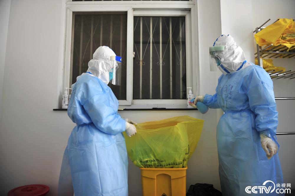在结束一上午的样本采集工作后,马娇(左)与刘翠在对医疗废物进行消毒。