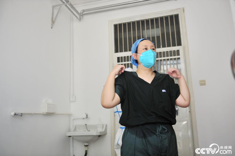 脱下双层防护服的马娇已是汗流浃背,防护用具在马娇脸颊上的印记迟迟不能褪去。