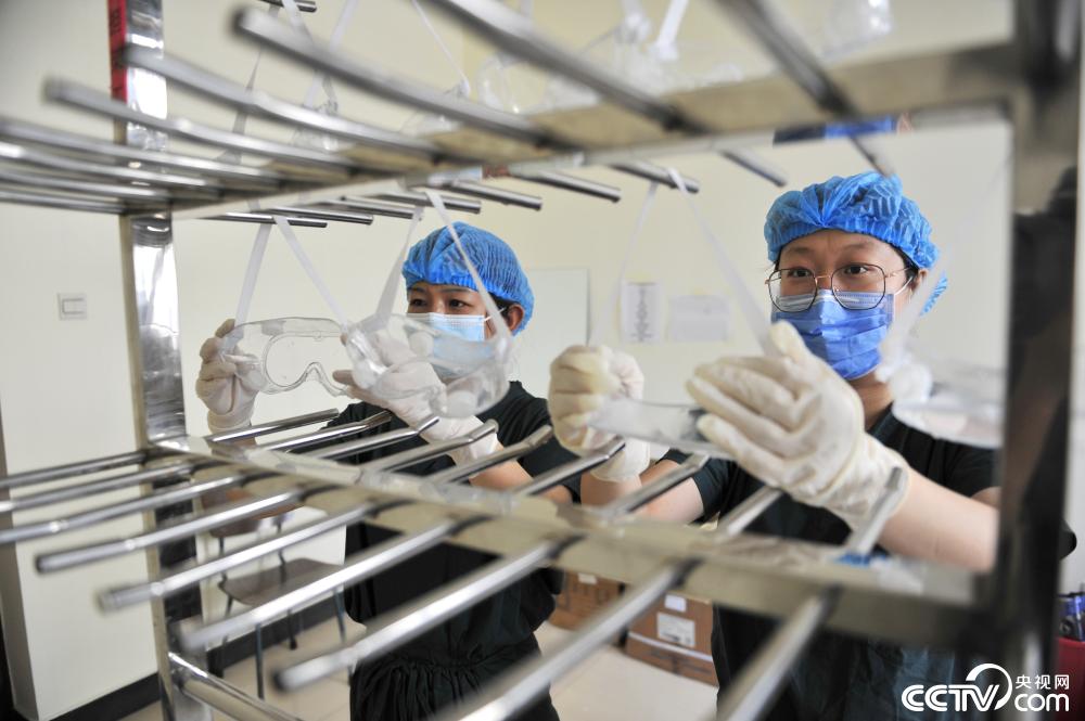 在北京市门头沟区医院的医疗备品库房,核酸采集员刘丽虹(左)与刘亚欣与在对医用护目镜进行使用前的消毒作业,同为核酸采集第一梯队的她们前一日刚从社区采集现场撤下来便投入到新一轮的工作中。