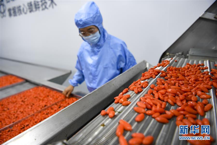 工人在锁鲜枸杞生产线上清洗、拣选枸杞鲜果(6月22日摄)。 近日,宁夏百瑞源枸杞股份有限公司与中国农业大学合作科研项目——锁鲜枸杞工艺技术正式运行投产。宁夏枸杞在市场销售中以干果为主。锁鲜枸杞生产线的投产,突破了传统的枸杞制干技术,不破枸杞表面保护膜,让宁夏枸杞传统制干模式迎来了新的变革。 新华社记者 冯开华 摄