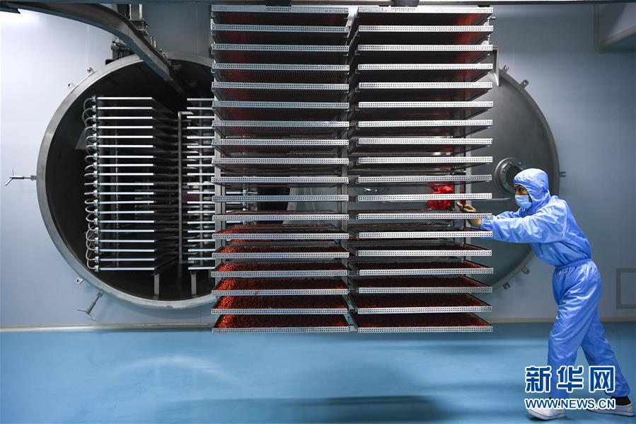 工人在锁鲜枸杞生产线上将枸杞鲜果推入密闭室(6月22日摄)。 近日,宁夏百瑞源枸杞股份有限公司与中国农业大学合作科研项目——锁鲜枸杞工艺技术正式运行投产。宁夏枸杞在市场销售中以干果为主。锁鲜枸杞生产线的投产,突破了传统的枸杞制干技术,不破枸杞表面保护膜,让宁夏枸杞传统制干模式迎来了新的变革。 新华社记者 冯开华 摄