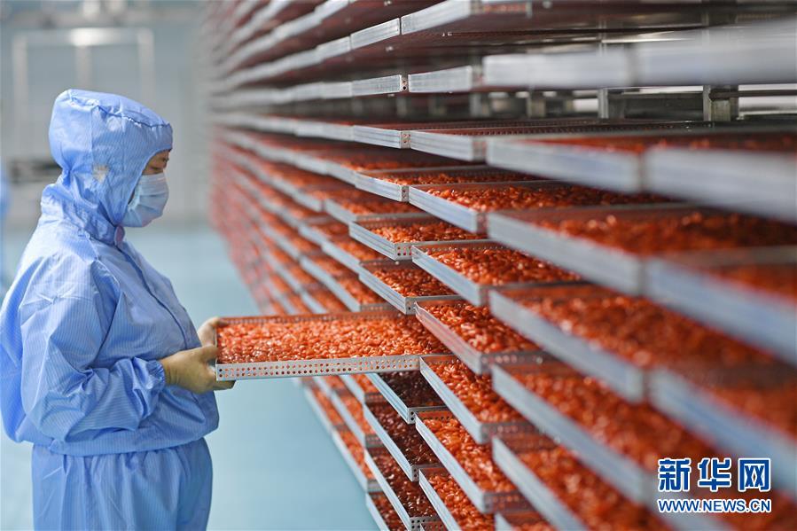 工人在锁鲜枸杞生产线上检查产品质量(6月22日摄)。 近日,宁夏百瑞源枸杞股份有限公司与中国农业大学合作科研项目——锁鲜枸杞工艺技术正式运行投产。宁夏枸杞在市场销售中以干果为主。锁鲜枸杞生产线的投产,突破了传统的枸杞制干技术,不破枸杞表面保护膜,让宁夏枸杞传统制干模式迎来了新的变革。 新华社记者 王鹏 摄