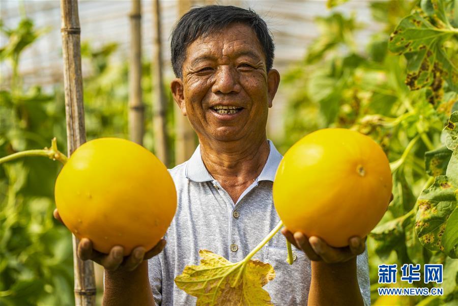 6月23日,枣强县唐林镇夏吉利村村民在展示采摘的香瓜。新华社记者 李晓果 摄