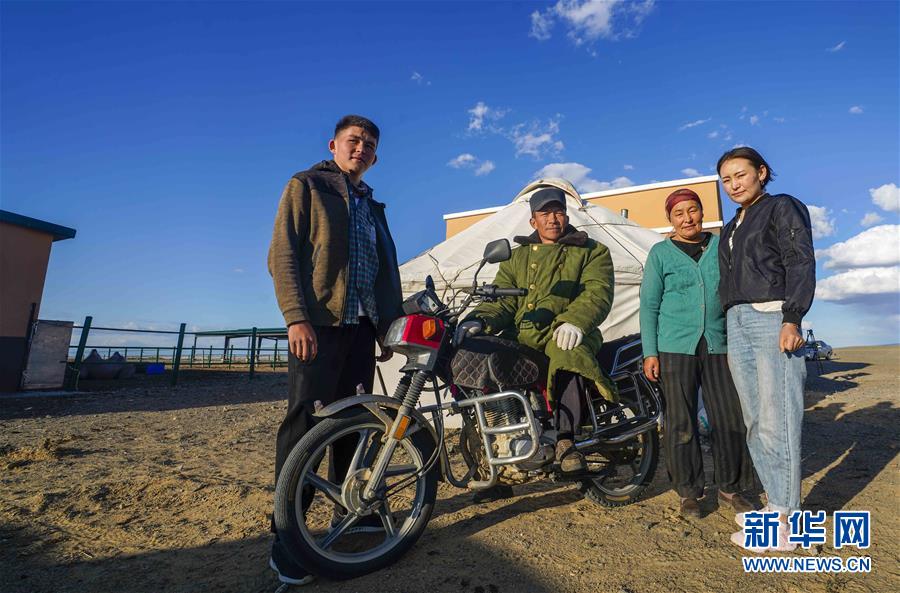 在吉木乃县万驼园内,牧民米拉木别克·阿依提克(左二)与家人在房前合影(6月21日摄)。新华社记者 赵戈 摄