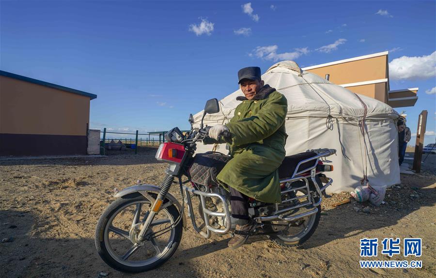 在吉木乃县万驼园内,傍晚时分,牧民米拉木别克·阿依提克准备骑着摩托车将骆驼赶回圈内(6月21日摄)。新华社记者 赵戈 摄