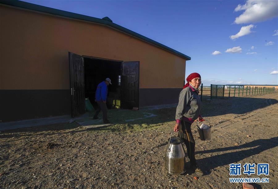 在吉木乃县万驼园内,一位牧民将刚收集的骆驼奶交到收奶处(6月21日摄)。新华社记者 赵戈 摄