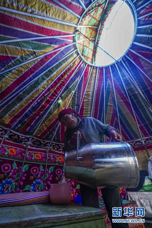 在吉木乃县万驼园内,一位牧民将一部分驼奶倒出留作自己食用(6月21日摄)。新华社记者 赵戈 摄
